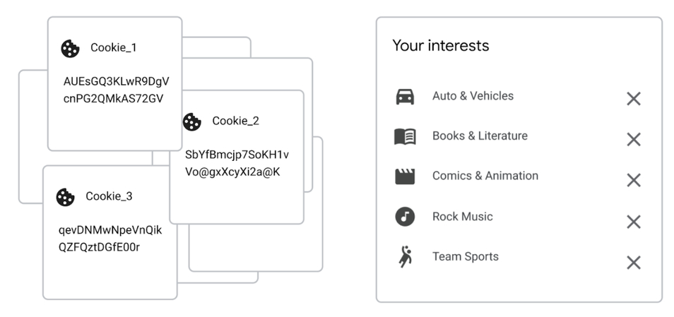 An illustration of what could be seen about 3rd party cookies (left) vs Topics (right) see below: