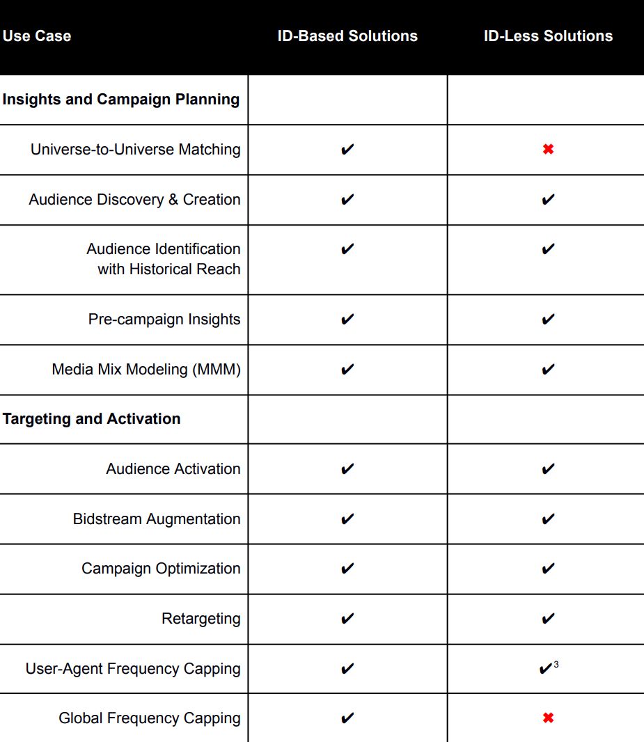 Clear definitions and insights into the differences between ID-based & ID-less solutions are provided and very usefully broken down by different uses cases (see some examples below) across a wide range of different requirements.