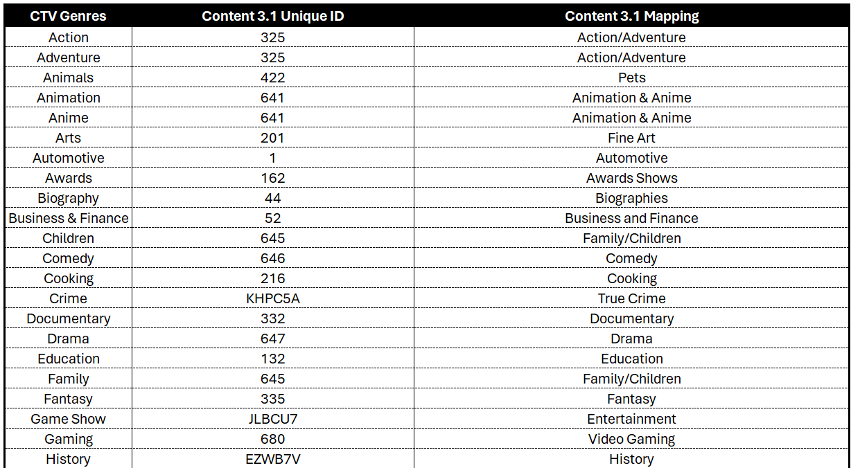 - Subset of Content Taxonomy 3.1 for CTV Genres and Implementation Guidance.