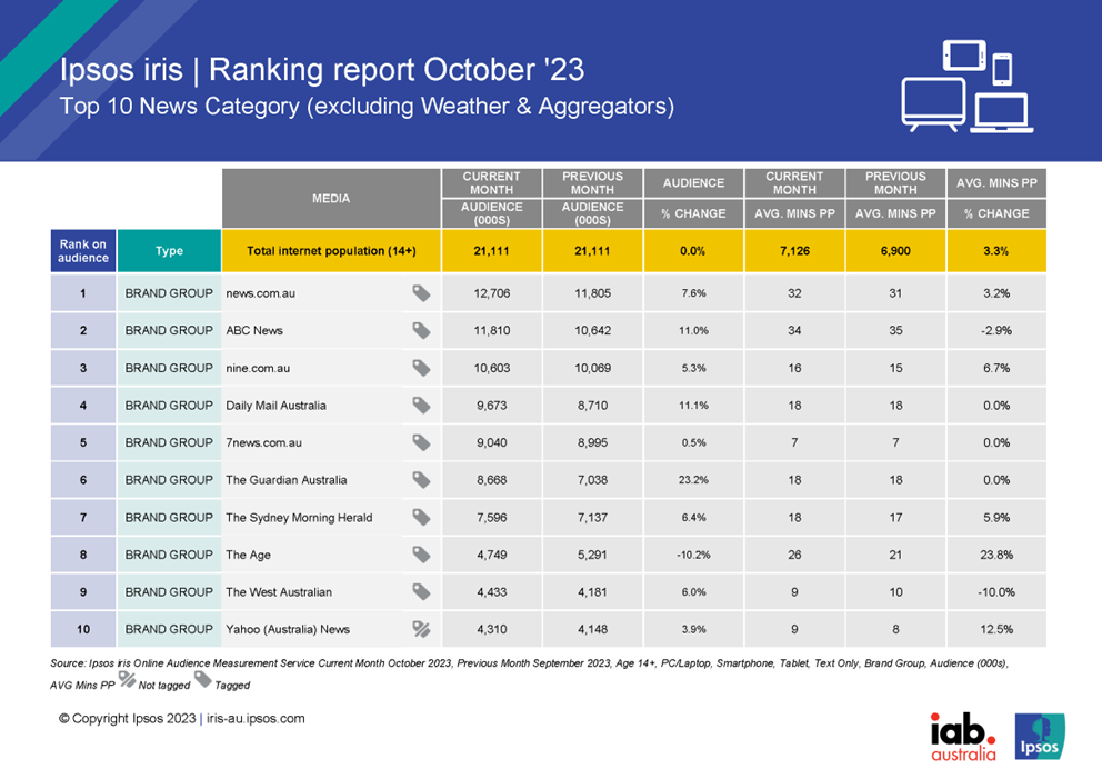 In addition, major global and local news events including the Voice referendum, the NRL Grand Final wrapping up the footy season, the Hamas attack on Israel, the untimely deaths of Friends star Matthew Perry and comedian Cal Wilson and the murder of a young coach at St Andrew’s School in Sydney, saw consumption of online news content reach 20.3 million for the month of October.