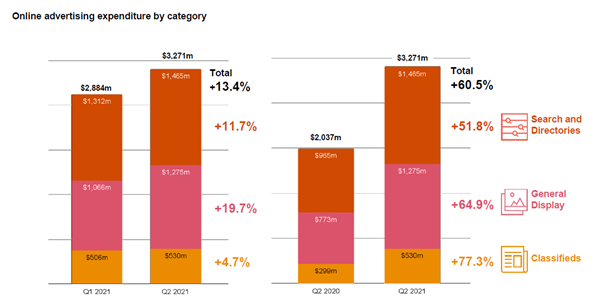 In the 12 months ending 30 June 2021, all sectors of online advertising experienced double-digit growth.  Video advertising jumped 38.8% year on year to reach $2.4bn, general display grew 29.7% to $4.4bn, search and directories grew 22.3% to $5.1bn and classifieds grew 17.4% to $1.9bn.