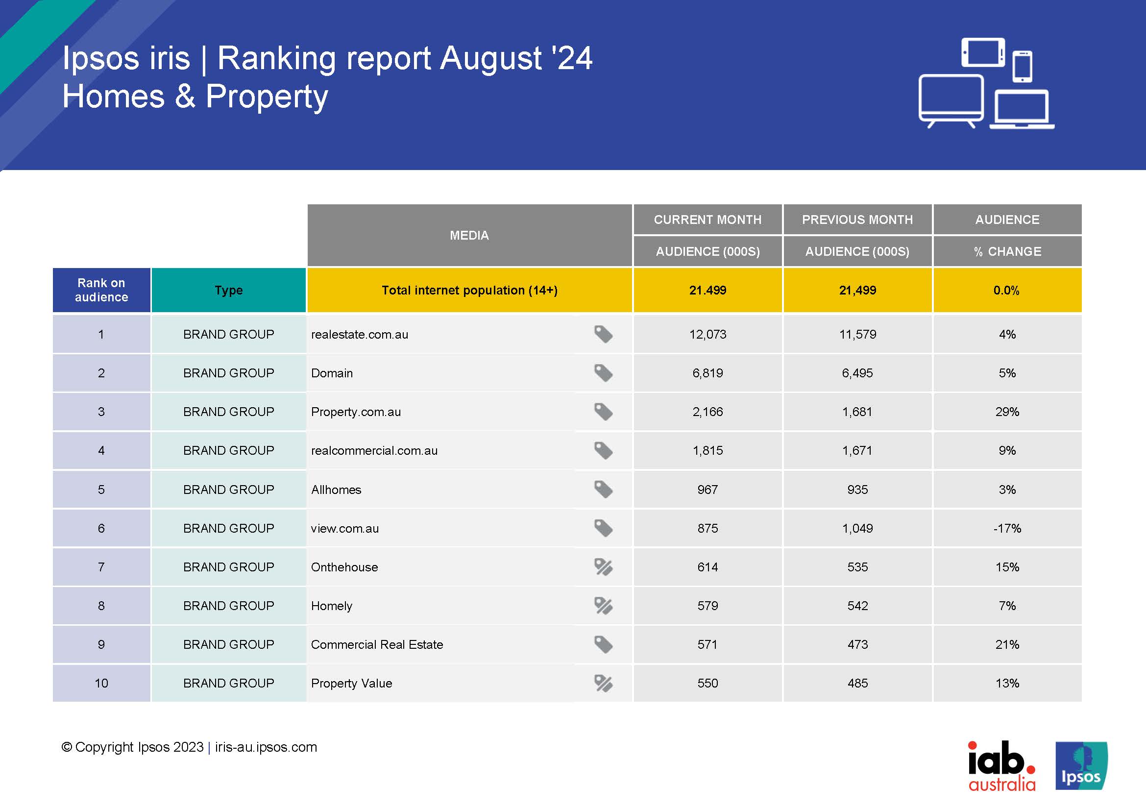 The homes and property category recorded an all-time audience high in August, peaking at just over 14 million Australians. The figure was the highest number recorded in both 2024 and in Ipsos iris history, with overall audience numbers increasing by more than 300,000 month on month. Major property brands realestate.com.au and Domain also recorded month on month audience increases of 4% and 5% respectively.