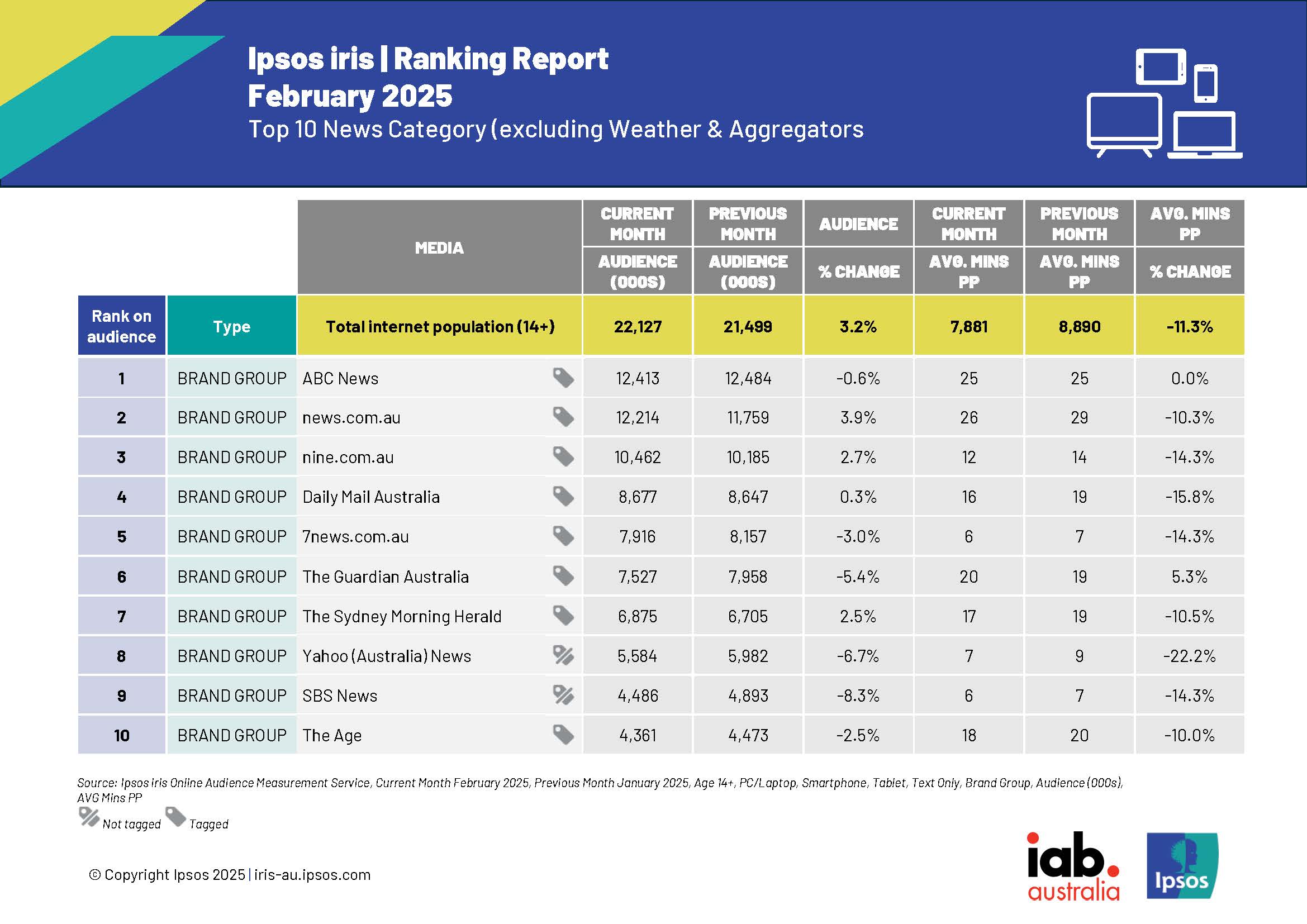 Categories with growth larger than the online population increase in February compared to January were the health, finance, business sectors (corporate and business information websites), education and directories. Categories with the largest year-on-year increases in online audiences were automotive (+10.3%), travel (+7.9%), career (+7.9%), games (+7.9%) and sports (+7.5%). Ipsos iris, Australia’s digital audience measurement currency endorsed by IAB Australia, showed that 22.127 million Australians used the internet in February. Australians aged 14+ spent an average of 4.7 hours per day, or 131 hours for the month, online in February 2025, which was up 6.8% compared to the same time last year. The most consumed website and app categories in January were search (22 million), social networking (22 million), technology (22 million), retail (21.8 million) and entertainment (21.7 million).