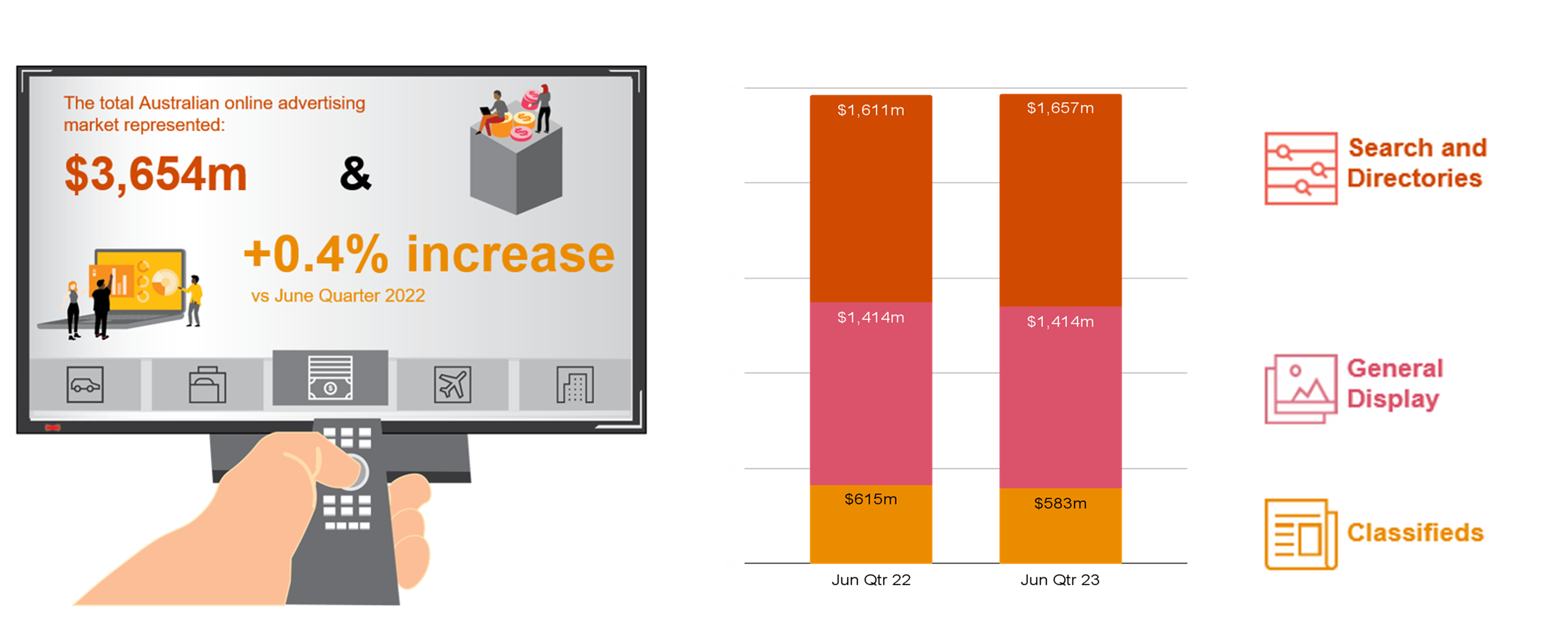 Video advertising, up 8.9% on FY22 ($3.5 billion), continues to outperform the broader general display advertising market with its growth offsetting declines in other formats of general display. The Audio category totalled $236 million and represented 4.3% of the general display advertising market, no comparative trend data is available for audio as reporting started in CY22. Search and directories is the largest contributor to overall advertising growth, up 3% on FY22 ($6.2 billion). Classified advertising investment grew modestly by 0.9% on FY22 ($2.4 billion) impacted by slower property market activity. General display, which includes video, audio and other forms of display advertising, also grew by 0.9% on FY22 ($5.5 billion) on a strong prior year which included the Olympics and Federal Election.