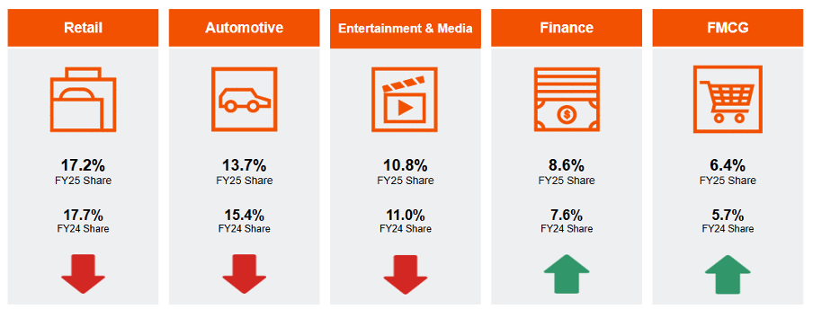 • The top five industry categories remain unchanged from June 2024, with retail benefiting from strong end of financial year spend to hold the greatest share, followed by automotive, entertainment & media, finance and health & beauty.