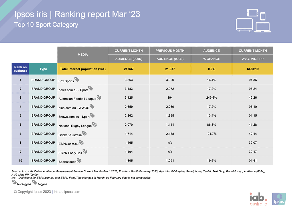 27 April 2023 – The opening rounds of the AFL and NRL footy season saw time spent per person consuming online sports content double in March to 74 minutes on average a month, up from 35 minutes in February, according to Ipsos iris, Australia’s new digital audience measurement currency endorsed by the IAB Australia.