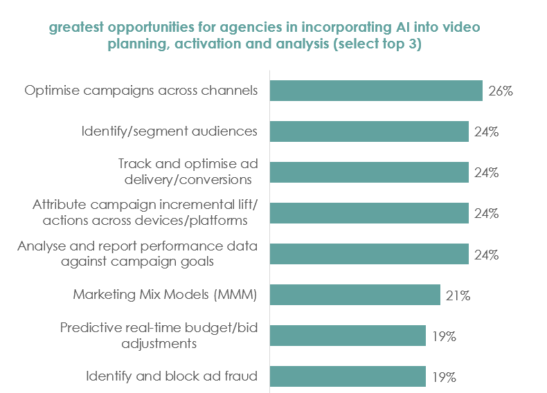 - 26% of agencies identified optimising campaigns across channels as the greatest opportunity for incorporating AI into video planning, activation. The next four opportunities flagged included identifying and segmenting audiences (24%), tracking and optimising ad delivery or conversions (24%), attributing campaign incremental lift (24%), and analysing and reporting performance data against campaign goals (24%).