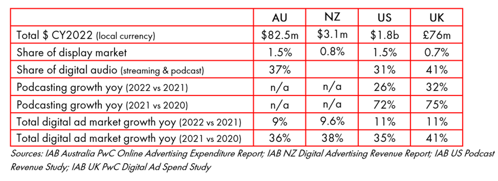 IAB Australia has just released the March quarter results for the podcast ad market with revenues totalling $19.8 million, an increase of nearly 21% compared to 2022 March quarter. As the full calendar year reports from IAB in NZ, US and UK have now been released we thought we would pull together a comparison across the four markets.