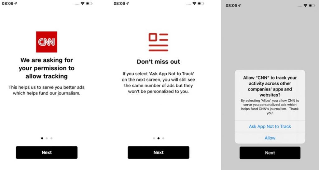 Soft native prompts are a must for Publishers/ Developers to try to explain the value of opting-in and get users in the best mindset to give consent to use their data. A great example is one we’ve seen from CNN (Screen 1+2 are pre-prompts):