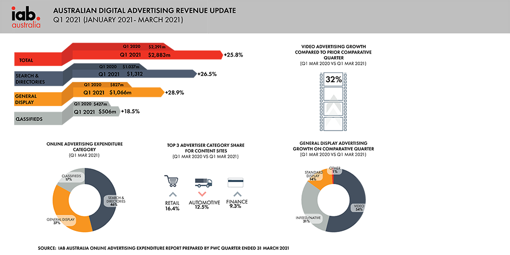 The Australian digital advertising market has continued its strong growth trend, to reach $2,883m for the March quarter 2021, up 25.8% year on year. The data which is drawn from the IAB Australia Online Advertising Expenditure Report (OAER) prepared by PwC, shows that retail advertising is surging and classified advertising is rebounding reflecting the overall health of the Australian economy and increasing consumer confidence.