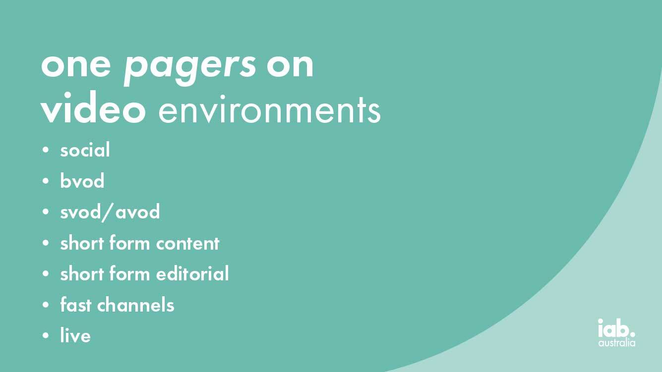 The IAB Australia Video Council continue to work on resources for agency groups and brands to utilise when considering advertising in Video. These one pagers provide an overview of the environment, how it works with other buys and any key watch-outs that may be useful.