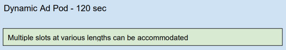 Dynamic Pod: The seller offers a pod structure where the number of ads and the duration of each ad in the break is indeterminate, but the total duration and maximum number of ads are constrained. In other words, the total duration of the pod is known, but the number and duration of the individual ads within the break may not be defined ahead of time. This allows bidders more flexibility to optimise their selection of ads across the demand on their platform.