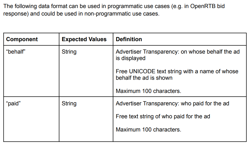 • paid – Advertiser Transparency: Free UNICODE text string of who paid for the ad. Must always be included even if it’s the same as what is listed in the behalf attribute.