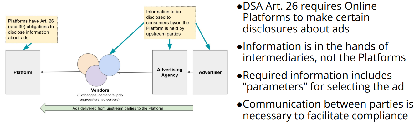 Although the legal obligation to provide the user-facing information disclosures applies to VLOPs, it is clear that in many advertising scenarios those platforms will need to rely on ad tech vendors for the data that will be required to populate the disclosures. As a result, ad tech intermediaries could come to play crucial roles in aiding online platforms in meeting their compliance obligations in relation to advertising.