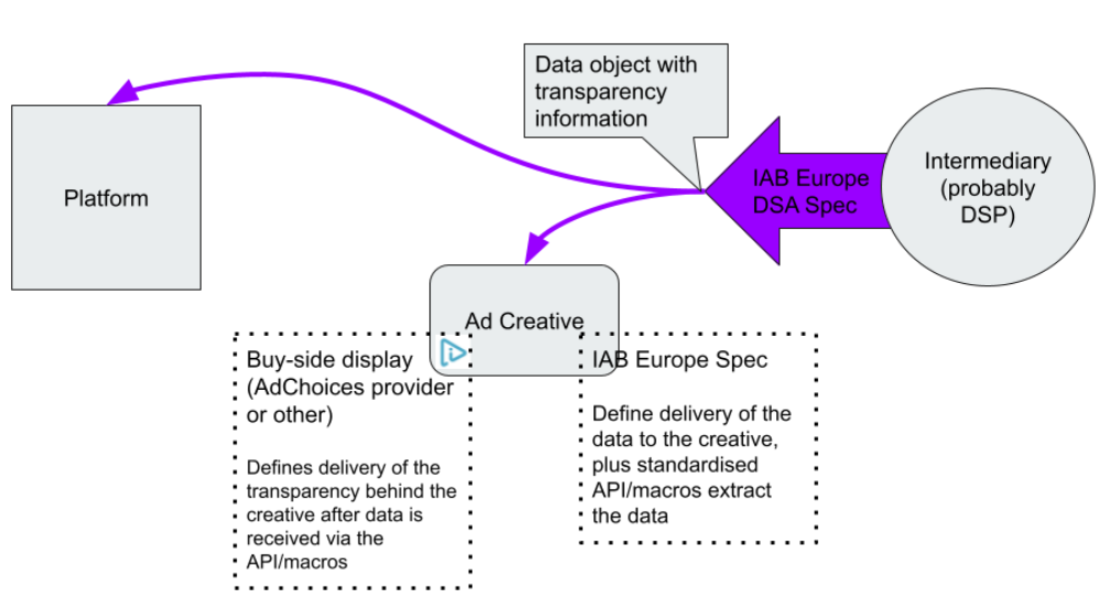 To ensure that these third parties are equipped to provide this support, IAB Europe has set out to standardise a protocol for compiling and delivering the required information through the ad supply chain such that it could be received by the online platform, or another party acting on its behalf, to make the disclosures to users. For instance, for the Advertiser Transparency requirements – see below as the proposed solution for the transfer of the necessary transparency information: