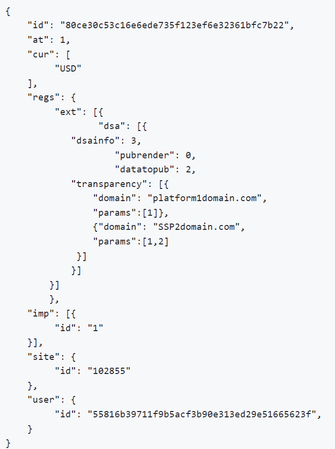 Sample OpenRTB 2.6 Bid Request with DSA transparency: