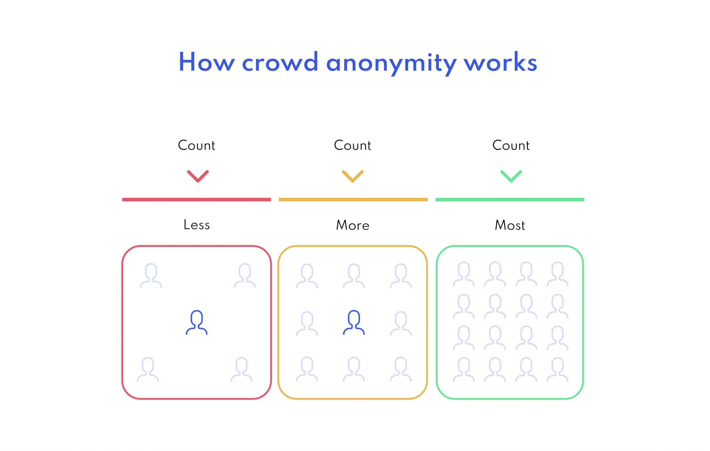 Crowd anonymity is a form of PET (Privacy Enhancing Tech) and is how Apple determines the level and type of data that will be returned via an AdAttributionKit postback. It is designed to protect individual user privacy by aggregating data within larger groups of users, making it impossible to identify single users within the datasets. The basic concept is that as the number of users or installs increases, the level of anonymity also increases, allowing for more detailed data to be shared without compromising individual privacy.