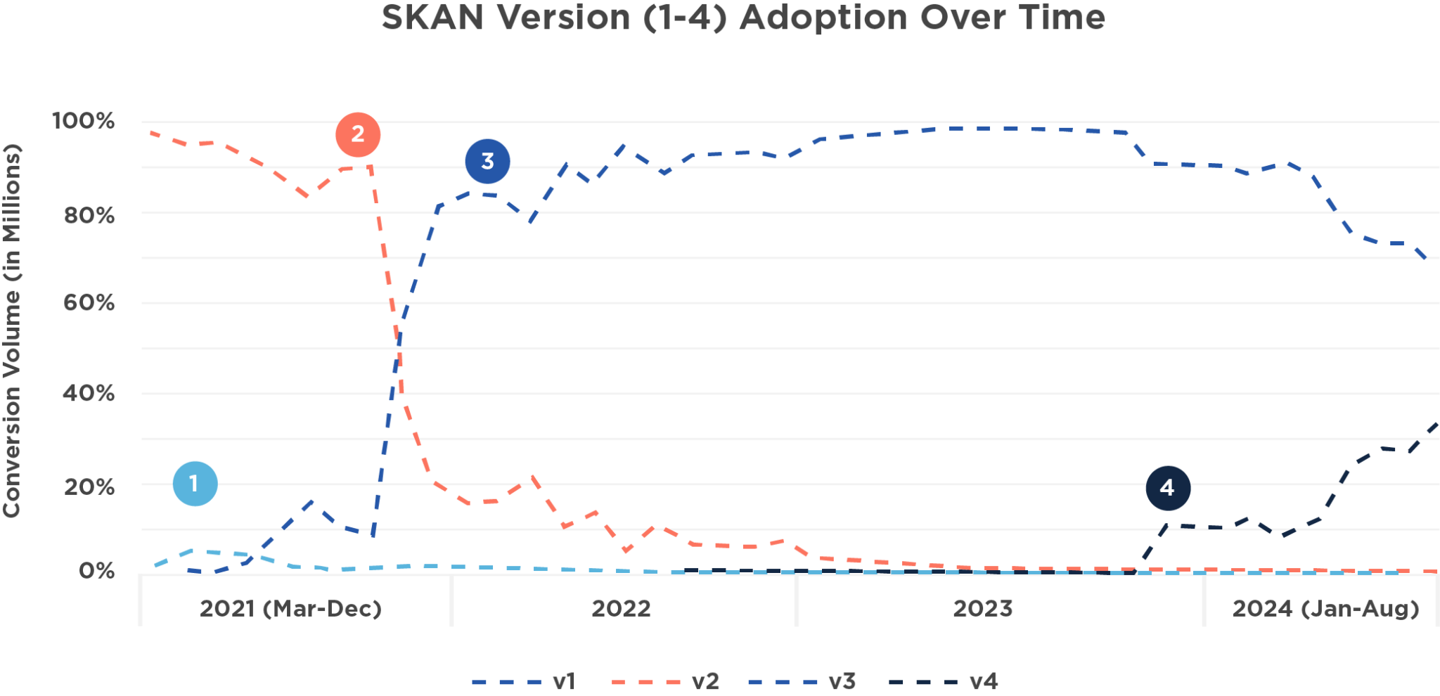 The ATT feature change resulted in a dramatic drop in leverageable signals for marketing in iOS and concurrently in order to measure ad campaigns in iOS, marketers were obliged to leverage an API called the SKAdNetwork (or SKAN) – which was Apple’s original API-based, privacy-centric framework for attribution and ad measurement. SKAN provides aggregated insights to advertisers, but with no user level data and has been through various iterations since 2021 as per the below:
