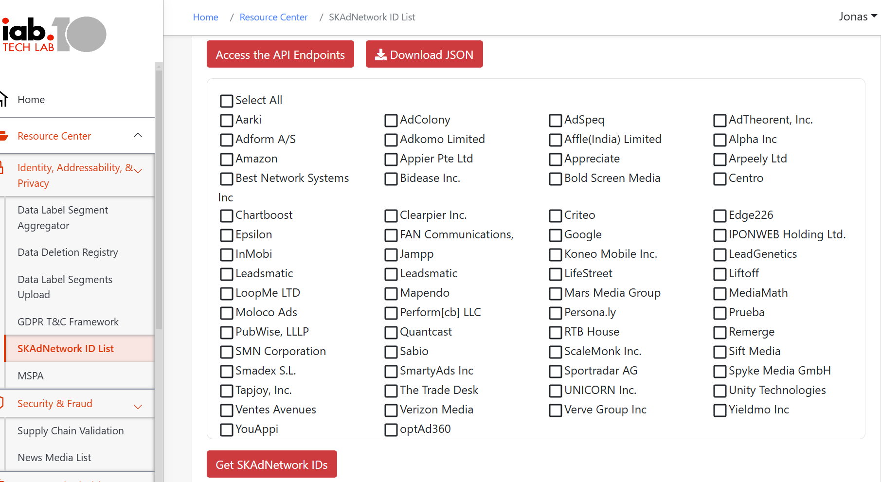 The IAB Tech Lab has for some time now been running a tool for managing and maintaining your SKAdNetwork ID list. Advertisers, DSPs, and networks can register their SKAdNetwork IDs and the tool will publish a list of all registered IDs that can be downloaded by app developers and publishers.