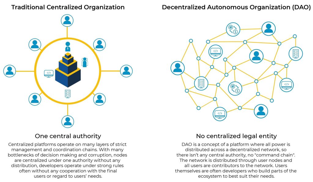Decentralised autonomous organisations (DAO) – are entities that can be managed through rules encoded as computer programs that are transparent, controlled by participating members and not influenced by any on central entity.